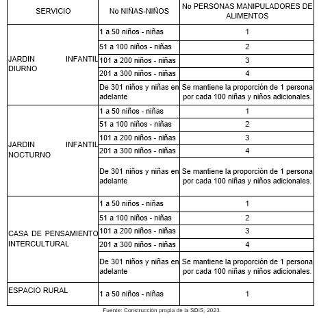 Cuenta con personal exclusivo para manipulación de alimentos, con formación básica secundaria. Con experiencia relacionada de 6 meses en cargos similares, cualificación en principios de buenas prácticas de manufactura de alimentos y educación sanitaria con vigencia de un (1) año. La disponibilidad en el servicio se debe presentar en la siguiente proporción: